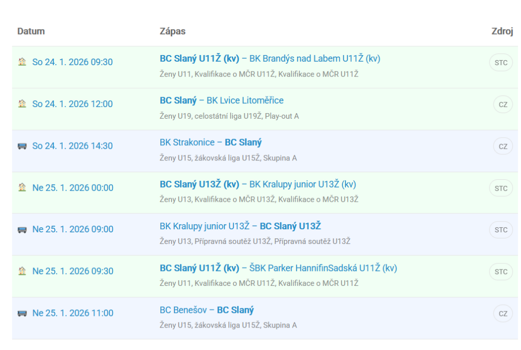 Na našem webu www.bcslany.cz nově můžete vidět rozpis všech nejbližších zápasů napříč všemi kategoriemi našeho klubu. Zobrazují se zde všechny zápasy pořádané pod ČBF i středočeskou sekcí, ale „neoficiální“ přátelská utkání a zápasy šmoulinky zde bohužel nejsou, protože data o těchto zápasech nejsou dostupná na webech CBF a STC.CBF, ze kterých je tato tabulka automaticky plněna.